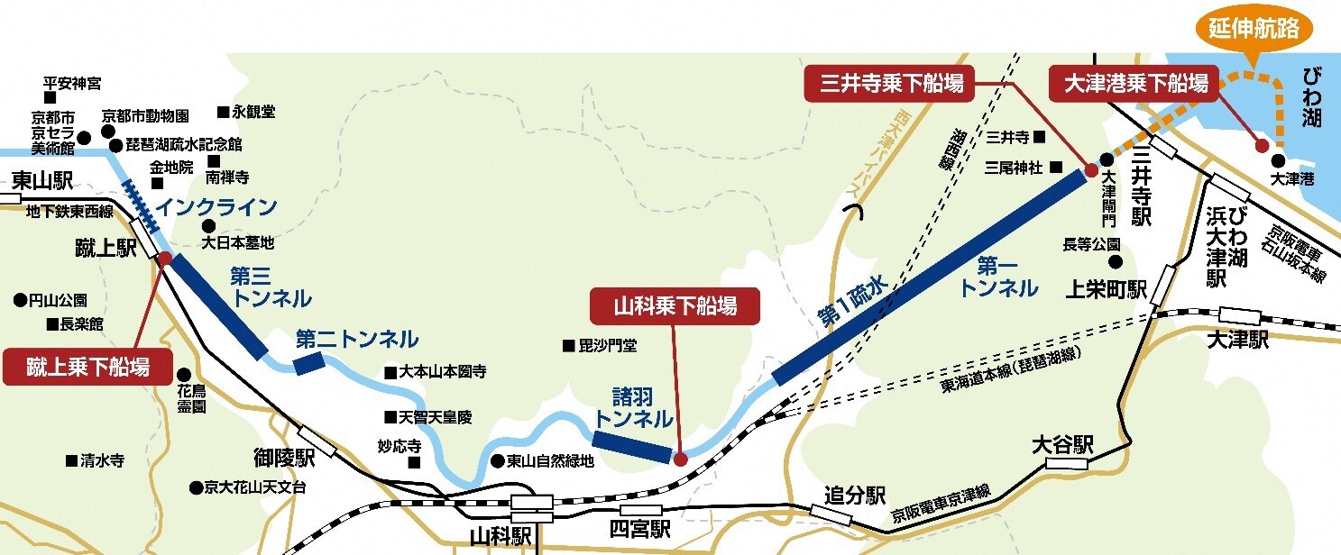 令和6年3月、「びわ湖疏水船」の大津側の乗下船場をびわ湖・大津港へと約1.5km伸ばし、「びわ湖疏水船」の魅力が3つの点で高まりました。